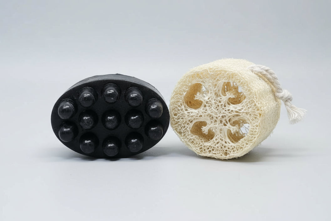 This upgraded soap bar combines the gentle nourishment of goat milk with the detoxifying power of activated charcoal and the purifying touch of tea tree essential oil, now sculpted into a massage bar with a natural loofah core for enhanced exfoliation and tactile pleasure.
